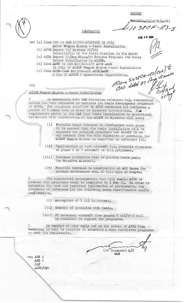 RCAF memo outlines that Genie work has not yet begun, but it must be complete when planes enter Squadron service. Costs must go up. Contract given to Avro to persue the Genie, it will take 4 years and have probable large increase in cost