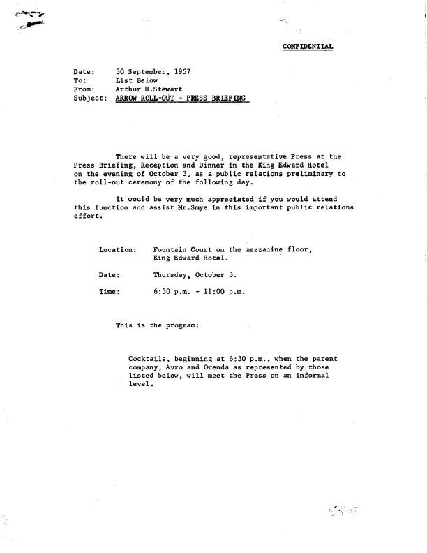 Memo to senior management outlining the schedule, seating, and security concerns for the Arrow roll-out press briefing and dinner on Oct. 3, 1957.