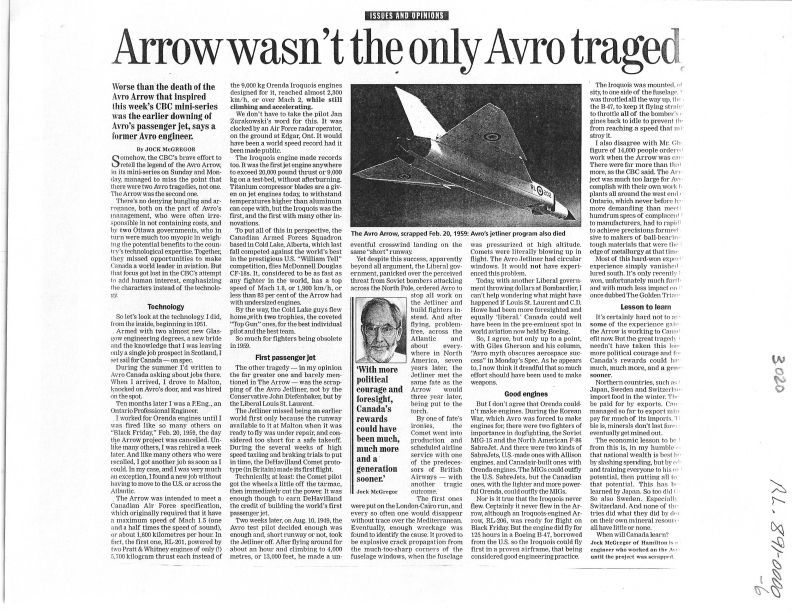 partial copy, newspaper article includes 202 in flight discusses Arrow, Jetliner, Iroquois