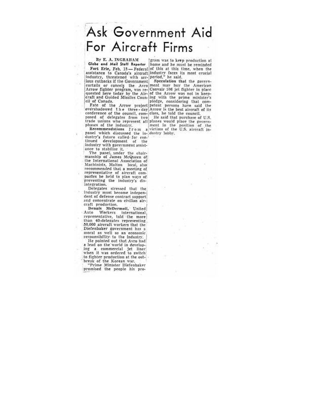 Aircraft and Guided Missile Council of Canada requests government support for the industry if the Arrow is cancelled. Also less reliance on defense and more on civilian aircraft is required. If purchases are from the US, Canada becomes a victim of the US aircraft lobby. James McQueen of the International Association of Machinists, Malton local recommended a meeting of aircraft companies to plan ways of preventing the industry's disintegration.General Notes