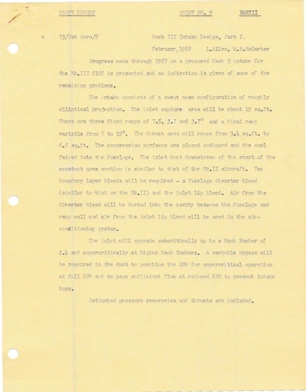 Assorted Draft Reports including Mark III Intake Design, Part 1 & Part 2, Method for Calculation of Propulsion System Net Thrust, Windmilling Buzz Boundaries; An Expandable Ejector Insert to Improve Arrow 2 Subsonic Cruise Preformance, Performance Calculations at Subsonic Cruises for Arrow 2 with Three Ejectors of Small Throat Diameter ratio; Arrow 3 Propulsion system, A Summary; Comparison between J75-A25, J75-B23 adn Iroquois 2 on Basis of Uninstalled net thrust adn specific fuel consumption; A Description of the Rumbling, buzzing and banging within the Arrow propulsion system; Escape from C105, Suggested modifications to C100 nacelle inlet to improve high speet, high altitude performance; A summary of a preliminary study for a Supersonic Jet Transport investigated in 1956; and others.Entry/Object ID