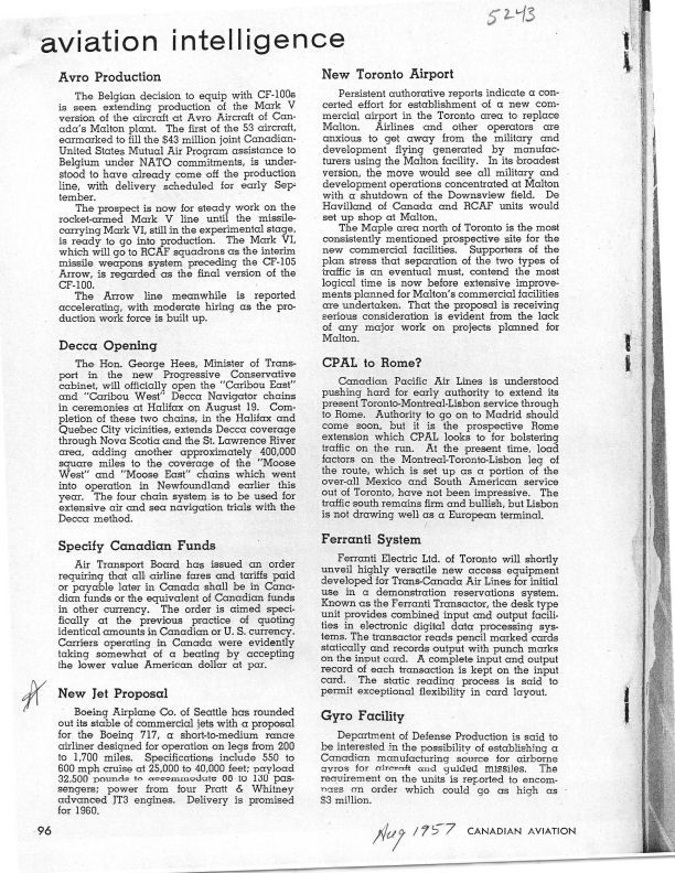 pg 96 Avro Production - Belgian CF-100 update. New jet Proposal - new Boeing 717 jet proposed. New Toronto Airport - discusses creating new Toronto airport and moving De Havilland of Canada and RCAF from Downsview to Malton.Publication Details