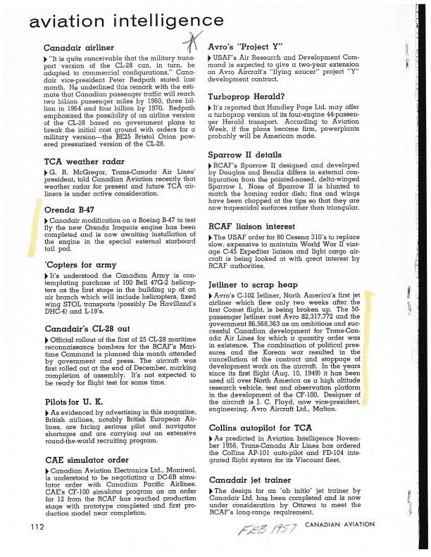 Pg 112 - Jetliner to scrap heap - Avro invested $2,317,772 and the government $6,568,636, the combination of political pressures and the Korean war resulted in the cancellation of the contract and stoppage. Avro's Project Y - USAF Air Research and Development Command expected to give a two-year extension. Orenda B-47 - Canadair's modification completed. CAE simulator order - CAE's CF-100 simulator program of 12 has reached the production stagePublication Details