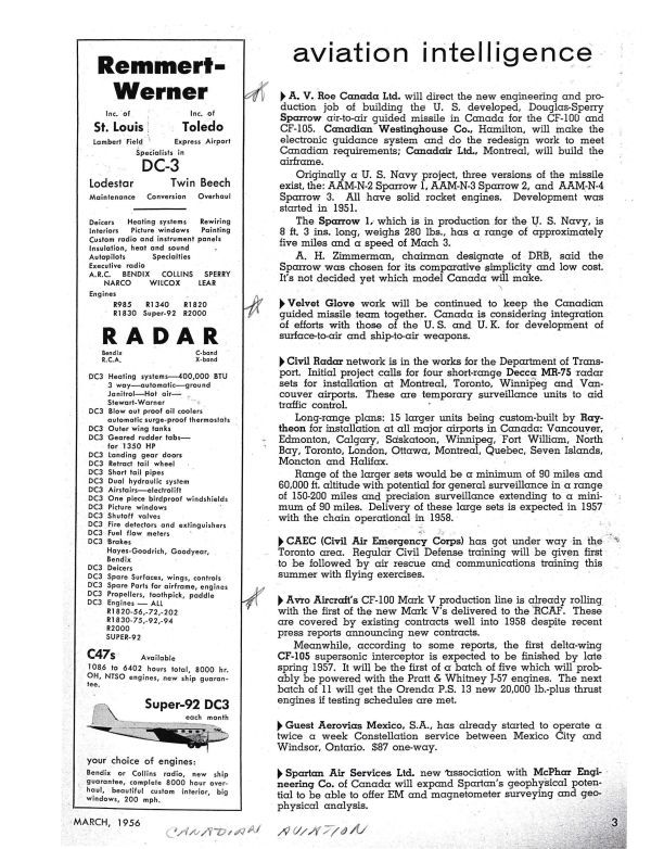 Pg 3 A.V Roe will direct the Sparrow program, the Velvet Glove work is ongoing. The CF-100 Mk 5 production line is rolling. The CF-105 is expected to be finished in the spring of 1957Publication Details