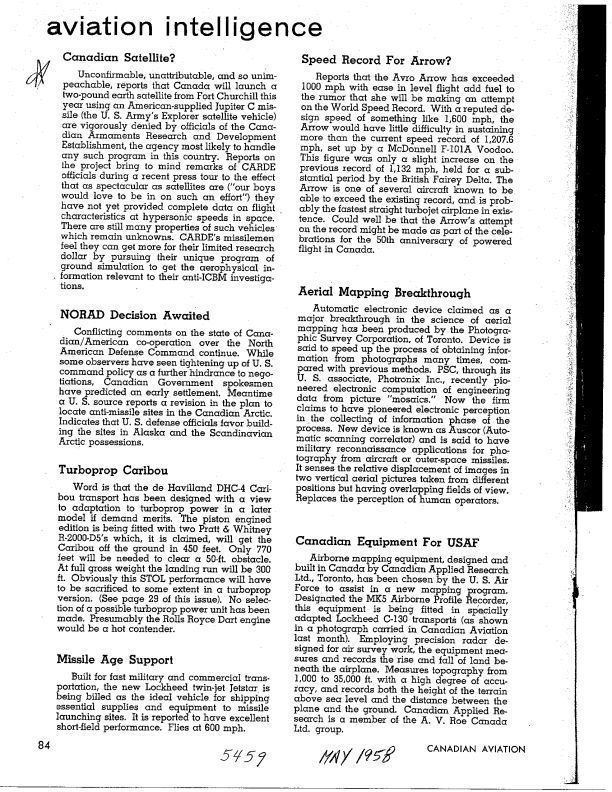 pg 84 Speed record for Arrow? - Reports that the Arrow will try to break the record soon, rumor of Canadian space launch denied, Canadian Applied Research chosen to assist USAF in mappingPublication Details