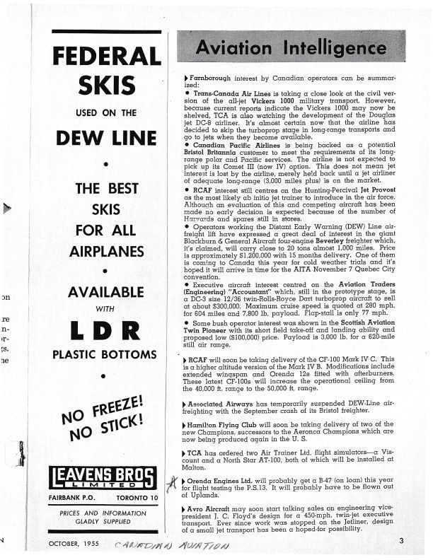pg 3 RCAF - soon taking delivery of the CF-100 Mark IV C - higher altitude version of the Mark IV B with extended wingspan and Orenda 12's with afterburners increasing the ceiling to 50,000 ft. Orenda Engines Ltd - likely to get loaned a B-47 to be used for flight testing (CL-52). Avro Aircraft - may start talking sales on J.C. Floyd's design for a 450 mph twin-jet executive jetPublication Details