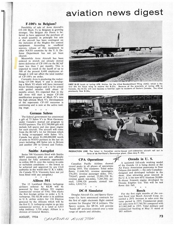 pg. 73 - CF-100's to Belgium (note original title was F-100's missing the C). / Orenda in U.S. pg. - 74 Iroquois - Engine cleared for flight test after completing 50 hours of static endurance testing. / Unique Installation - artist conception image of B-47 for Orenda's PS-13 Iroquois.Publication Details