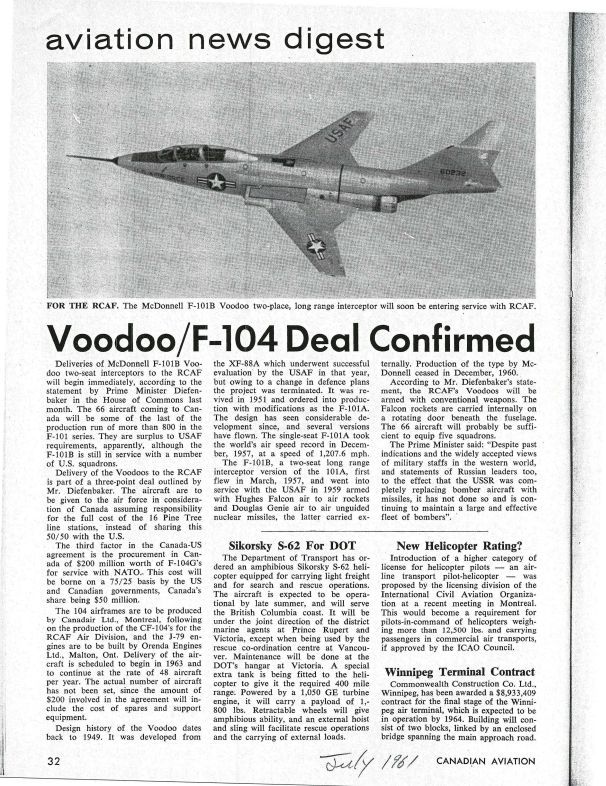 From Canadian aviation 1961 July pg 32 - Voodoo/F-104 deal confirmed - Diefenbaker confirms the deal, and states that there is still a significant bomber threatPublication Details