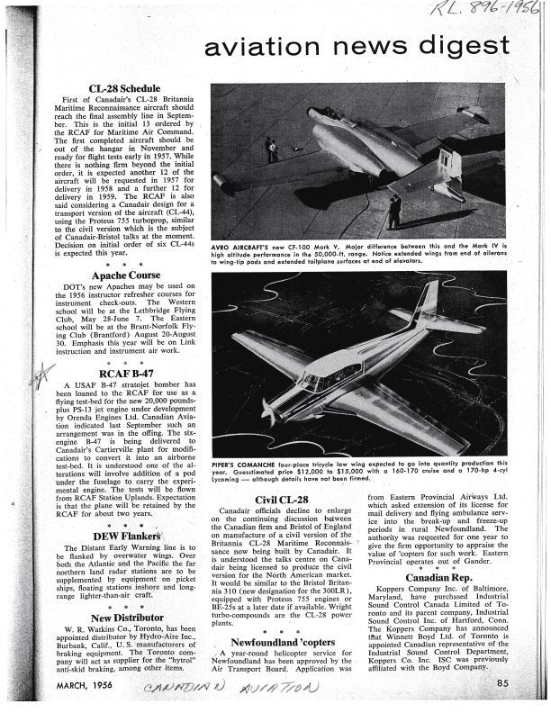 pg 85 - RCAF B-47 - Announcement of the B-47 as a test bed for the Iroquois. Avro Aircrafts new CF-100 Mark V. Image of the Mk 5 showing extended wings with photo of the CF-100 Mk V 18323Publication Details