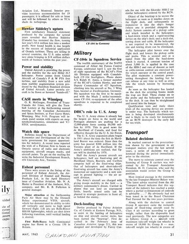 pg. 31 - Hawker Siddeley's Upturn - Hawker's finances improve. / Deck-Landing Trap - Fairey Aviation Co. of Canada's helicopters landing device has been named the "beartrap" (designed by a former Avro employee Mario P.).Publication Details