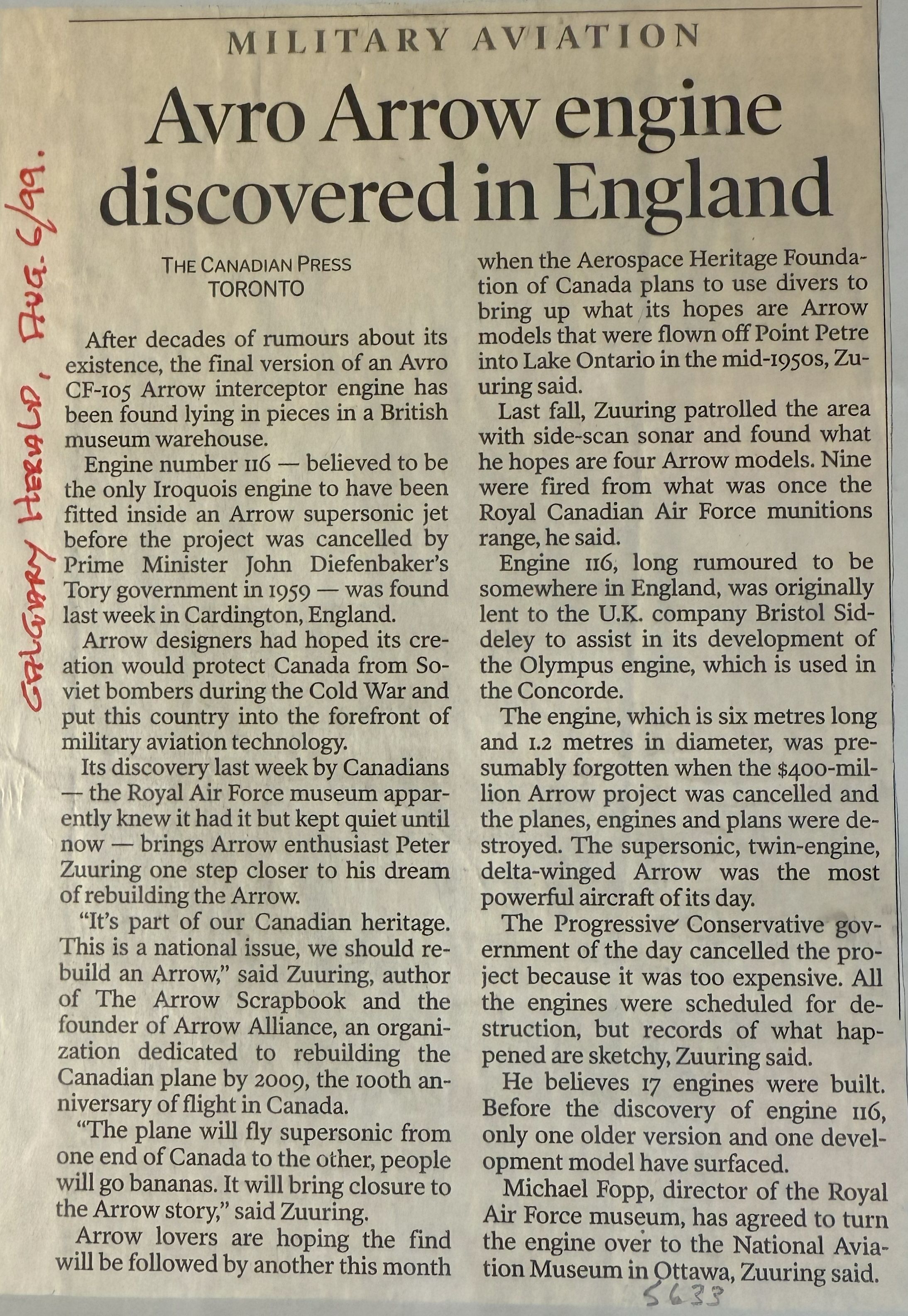Newpaper article about discovery of Orenda Iroquois engine No. 116 in the Royal Air Force Museum in England in 1999.Publication Details