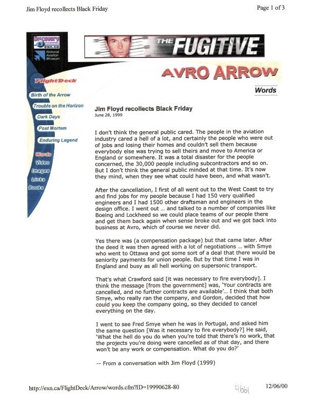 Avro Arrow - Jim Floyd recollections Black Friday