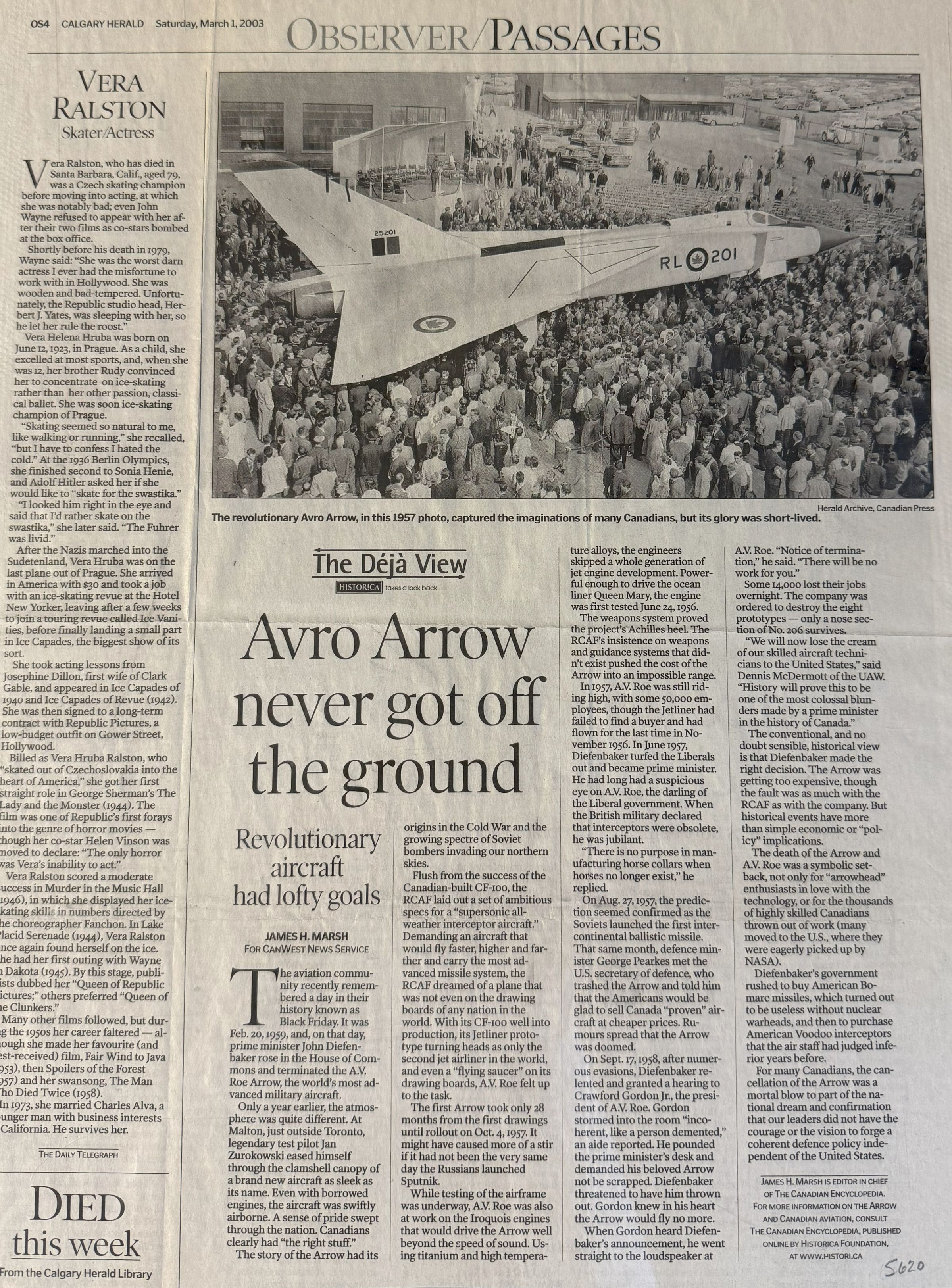 Article commemorating the Arrow and accounting for the decision to cancel the project. Lists CF-100; Jetliner; Iroquois engines; George Peakes; Diefenbaker; Bomarc missile; Voodoo aircraft.Publication Details
