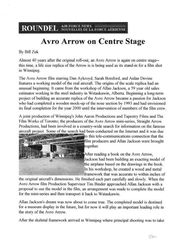 Printout of an article from Roundel, Air Force News, describing the production of the Arrow using Allan Jackson's replica in the CBC mini-series about the Arrow. Names include Sylvia Wooley, Derek Wooley, George Foley, Ely Yost.