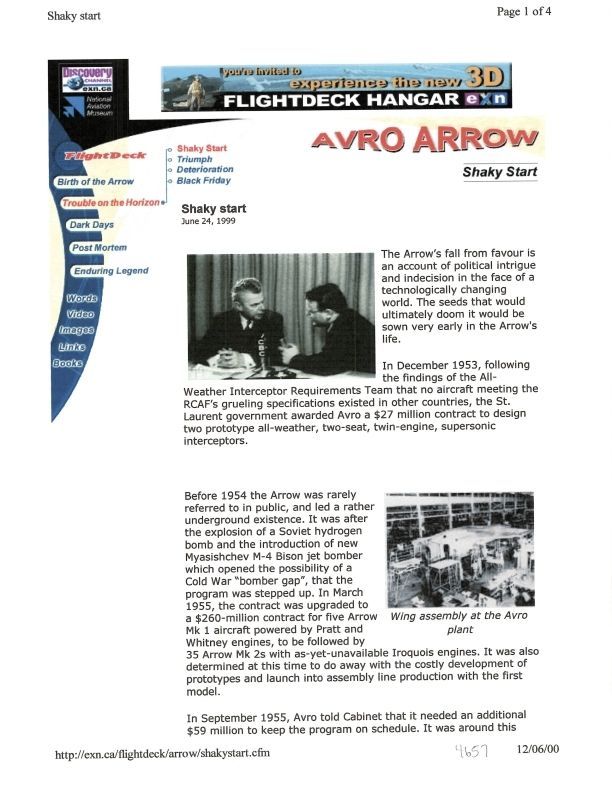 images of Dief, Arrow being assembled, wind tunnel Arrow, landing gear and BOMARC - with details of key things occurring at the time