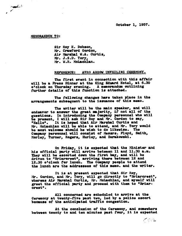 Memo to certain attendees detailing the schedule and events of the ceremony for the public unveiling of the first Arrow on Oct. 4, 1957. This memo provides a list of the official guests and dignitaries attending the unveiling ceremony, their accommodations, and schedules of arrival. Names include James "Jim" Charles Floyd, W.V. Hurley, J.A. Morley, Donald "Don" Howard Rogers, H.R. Smith, Frederick "Fred" Thomas Smye, J. Turner, Janusz "Jan" Zurakowski.