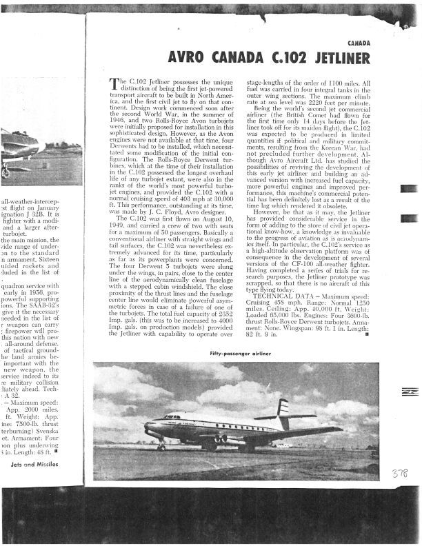 discusses C.102 Jetliner and its use in the development of the CF-100. Includes photo