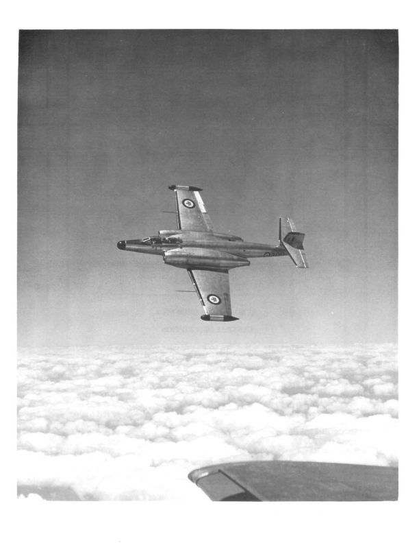 8 X 10 B&W glossy photogtaph of the CF-100 Canuck in flight, side view wingtip of photographer's aircraft visible. Reverse side includes drawing showing dimensions.General Notes