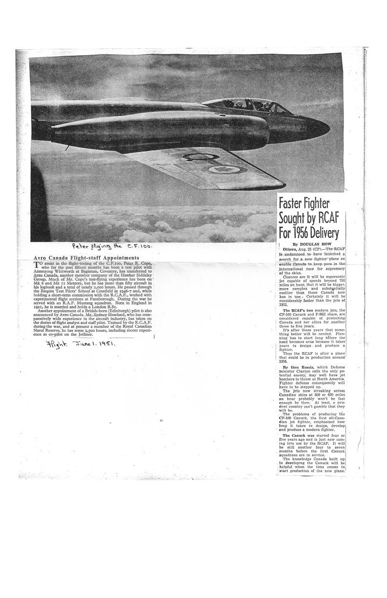 June 1/51 Flight Story, Peter R. Cope and Sydney Howland appointed as test pilots for the CF-100. Details Peter Cope's background at Armstrong Whitworth flying Mk 8 and Mk 11 Meteors and having more than fifty aircraft in his logbook and more than 2,000 hours. Sydney Howland's experience as co-pilot on the Jetliner and being a member of the Royal Canadian Naval Reserve documented. Second story "Faster Fighter Sought by RCAF for 1956 Delivery" detailing requirement for a new fighter able to fly beyond 750 MPH.General Notes