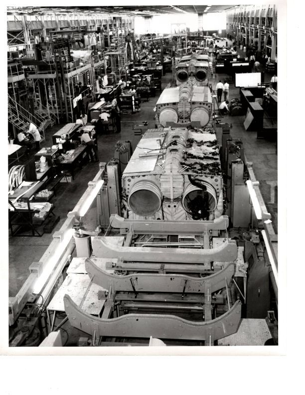 8 x 10" image of the Arrow production line. Caption on back states: General view of part of production line showing completed centre section units and final marry-up installation in foreground.