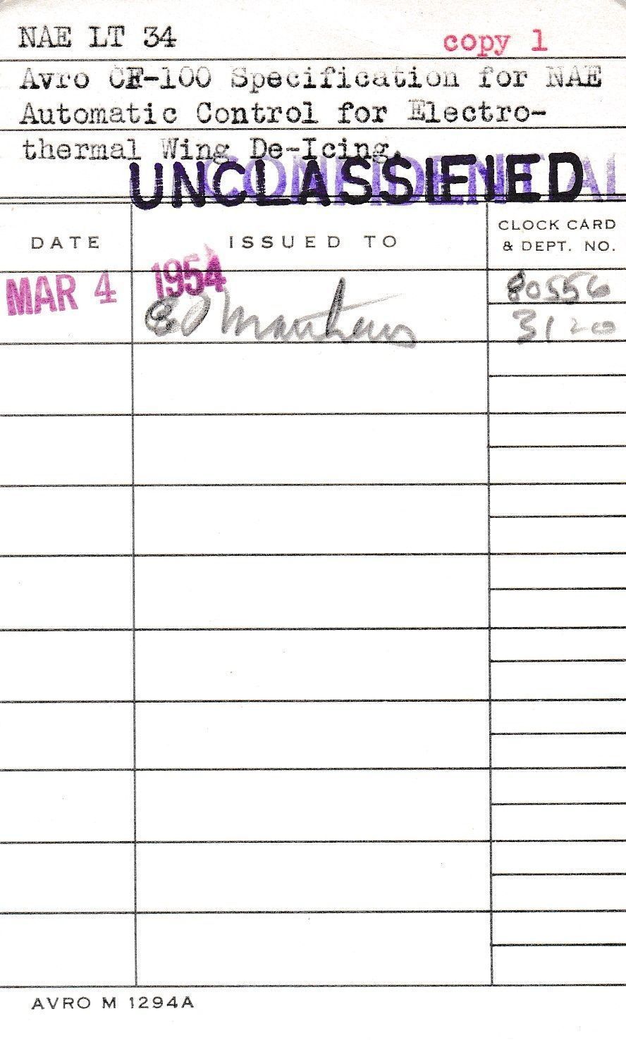 Avro Library Card - NAE LT 34 - Avro CF-100 Specification for NAE Automatic Control for NAE Electro-thermal wing de-icing systemEntry/Object ID