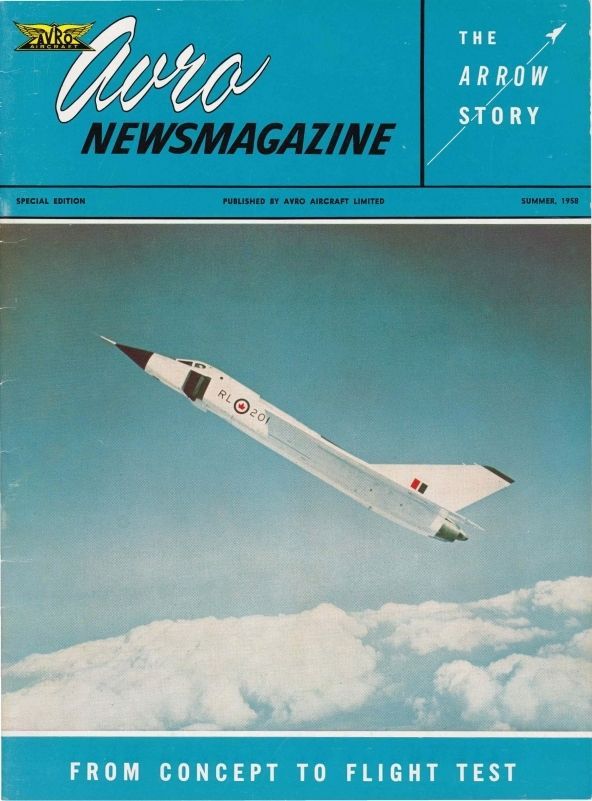 Special edition of the Avro Newsmagazine highlighting The Arrow Story - all aspects including first flight, some design specifics like 17000 drawings, 38000 parts, roll-out, construction and inspection. Names include Gordon (Andy) Anderson, Arnold Banks, James "Jim" Arthur Chamberlin, James "Jim" Charles Floyd, Crawford (Jr.) Gordon, Ray Hopper, Robert N. (Bob) Lindley, Władysław Jan (“Spud”) Potocki, Frederick "Fred" Thomas Smye, Janusz "Jan" Zurakowski, Stu Barefoot, Cy Beard, Harry N. Beffort, Harry Befort, Al Betts, E.B. (Ted) Bragg, Phil Brockwell, Peter Brown, Rupert Cashmore, Maurice Cobb, Dave Couperthwaite, Wilfred "Wilf" Austin Curtis, Roy Hardy Dobson, Ray Gibson, Len Goodenough, Wally Grandey, Sam Gray, Guest Hake, Stan Haswell, Cliff Heckel, Fred Hoplinson, Geoff Hughes, Jack Hurst, F/L Reg Kersey, Joe King, George Laidlaw, Bob Levitt, Roy Linegar, John Lockyer, Hugh MacKechnie, Al Maddeck, Bill McDowell, Walter R. McLachlan, Jim McLean, Cyril Meilton, Bill Moore, Verne Morse, Ron Northcott, Ron Nunney, Bill Osborn, S/L Ken Owen, S/L Gordon Patterson, John L. Plant, W.H. "Duke" Riggs, Horace Riley, Harold Roberts, John Salmon, Bill Seggie, Rex Simmons, Arthur H. Stewart, Johnnie Straboc, Granville Stuart, Russ Thompson, Len Thornquist, John Trollope, Norm Turrall, Lorn Ursel, W/C Gerrie Waterman, Harry Wilby, John Wilson, Lou Wise, Jack Woodman, S/L Bob Young.General Notes