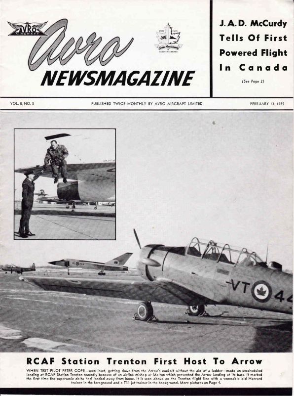 RCAF Station Trenton first to host Arrow with photos from Juch Hurst. Murray Willer, Sales and Service Manager elected chairman of the Export Committee of the Air Industries & Transport Association. Dick Smallman-Tew, chief metalurigist chosen to speak at 11th Western Metal Congress. Avro Safety Director Hugh McRae elected president of the Ontario Society of Safety Engineering. Surrounded by Models of aircraft - image with Parc Waters, Frank Hems, George Wakeman and Shorty Hatton (Superintendent of Experimental Inspection), photo taken by Vern Morse. Frank Hems Avro's Assistant Quality Control and Inspection Manager and George Wakeman, Personnel Officer in Avro's Engineering Division highlighted on page 3. Sports review by Stan Linnard with several employee's listed on page 6.