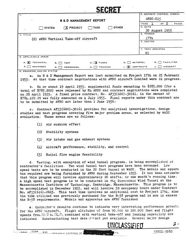 Details and Commentary on Contract with AVRO Aircraft Limited for Design and Testing of Project 1794 - 2 Page Management Report on Status of Contract with AVRO for Project 1794 and 3 Page Contact Specs.