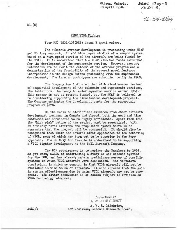 memo to file, status report on Avro VTOL fighter