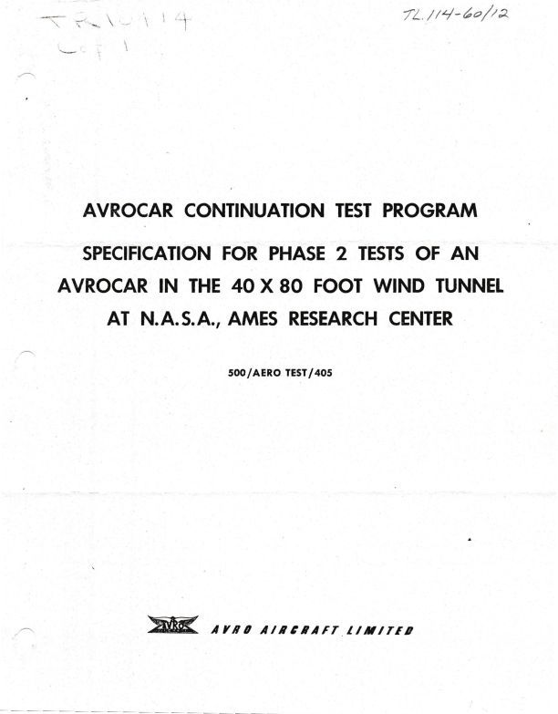 Avrocar Continuation Test Program, Specification for Phase 2 Tests of an Avrocar in the 40 x 80 Foot Wind Tunnel at N.A.S.A., AMES Research Center, 500/AERO Test/405, Issue 2Entry/Object ID