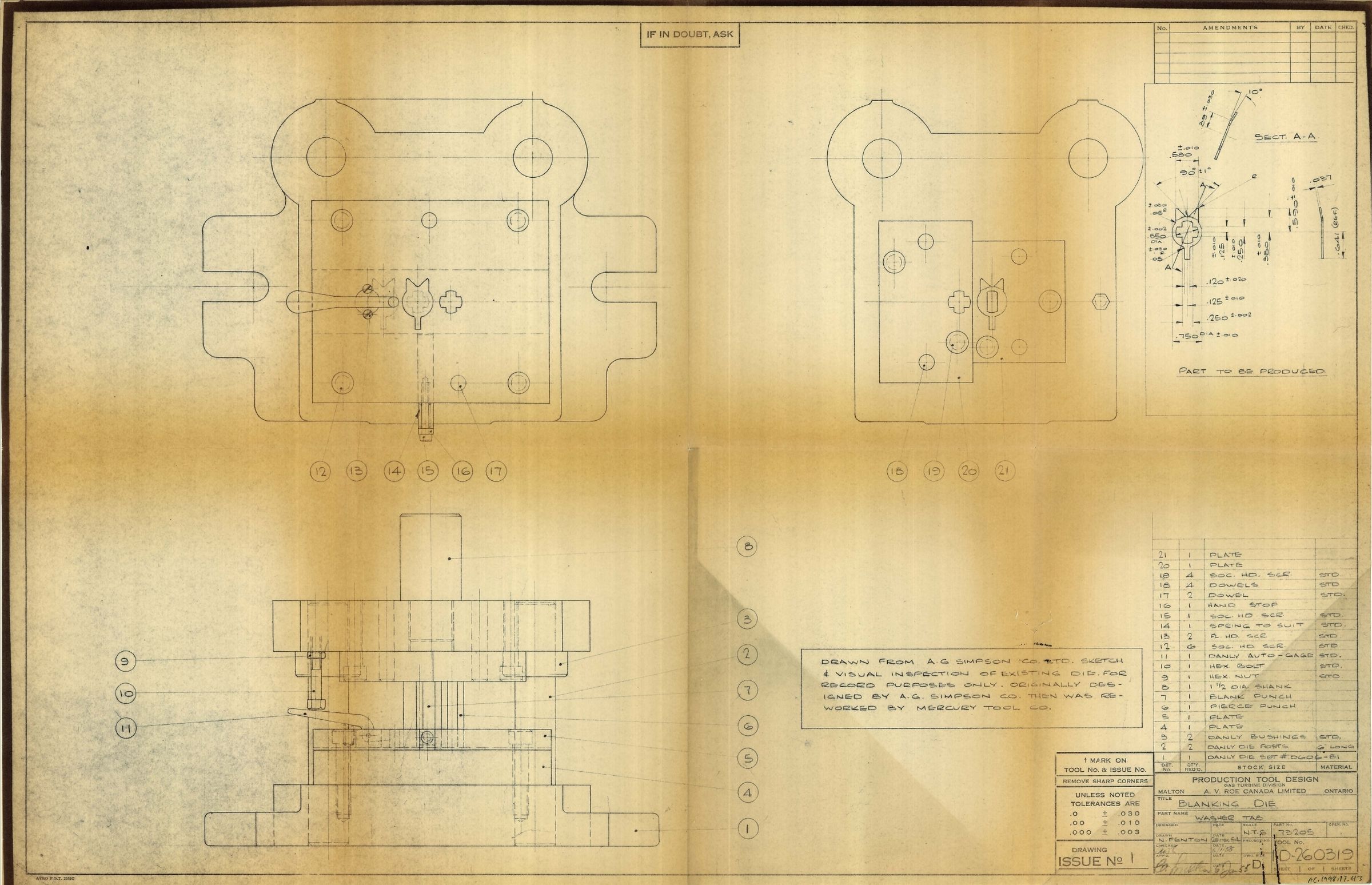 Blueprint of Blanking Die - Washer Tab Tool No. 1-D-260319 Part 73205
