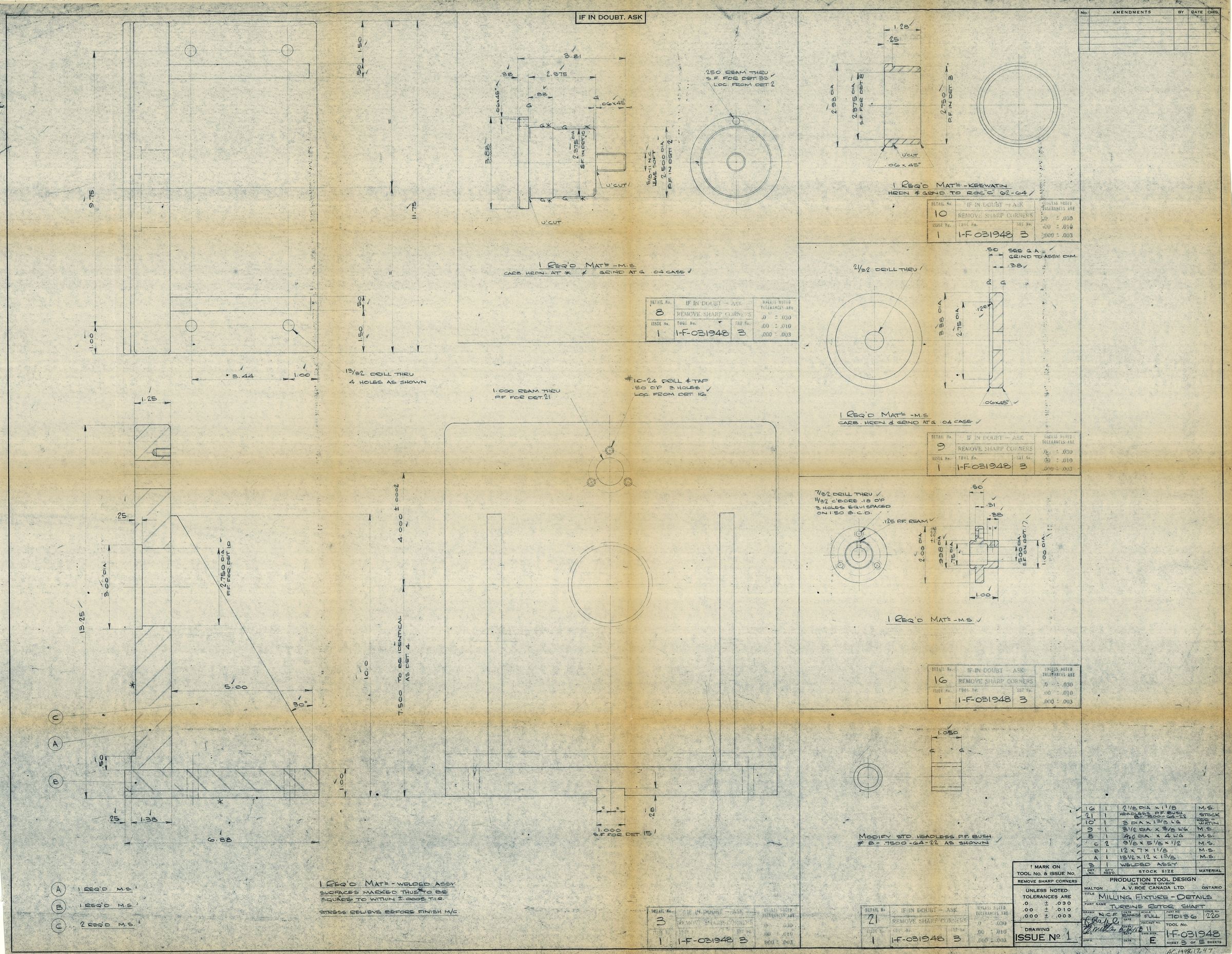 Blueprint of Milling Fixture - Details - Turbine Rotor Shaft -Sheet 3 of 5 Tool No. 1-F-031948 Part 70136