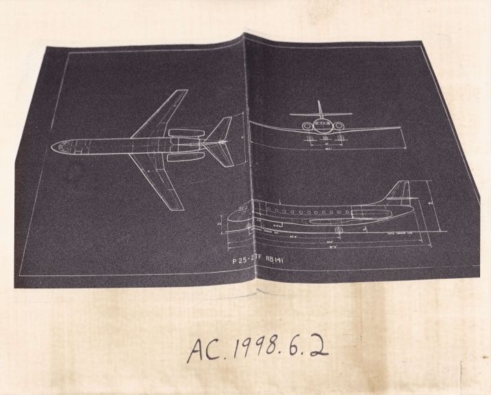 Photo of a drawing showing the 3 views of the P-25. Twin engines in rear of aircraft