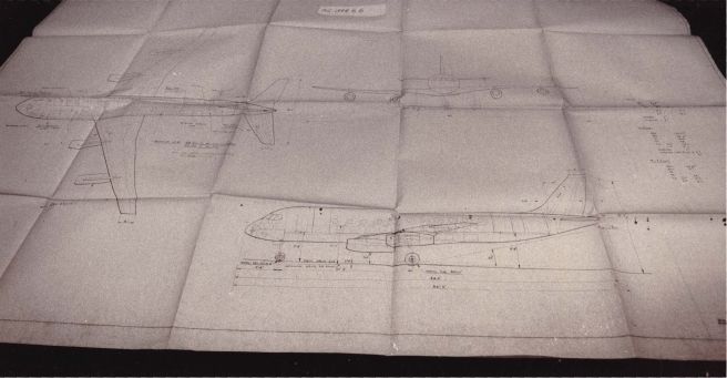 Photo of a drawing showing the 3 views of the P-25. Two engines on wings of aircraft