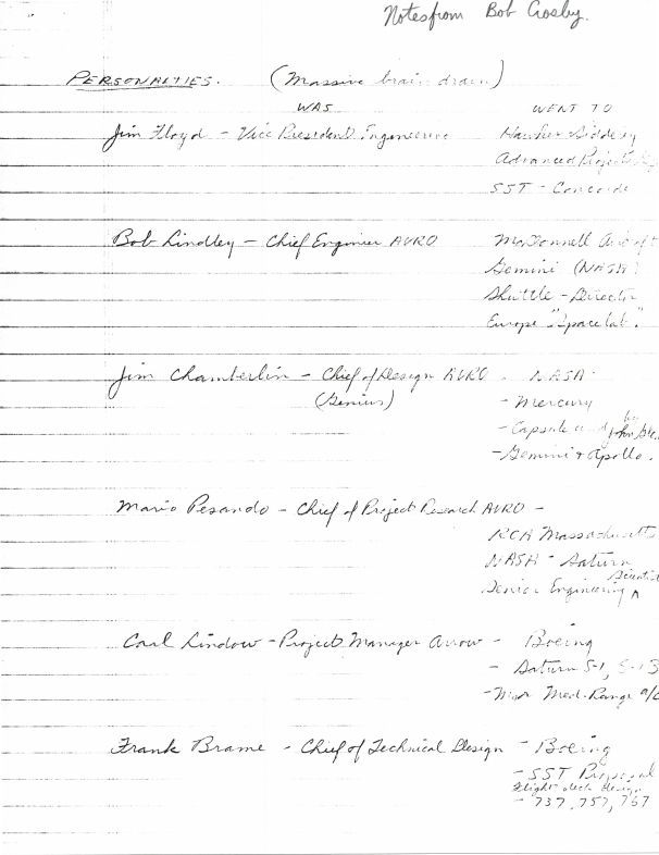 Avro names ("personalities"). Names include Jack Ames, Frank Brame, Al Buley, James "Jim" Arthur Chamberlin, James "Jim" Charles Floyd, Robert N. (Bob) Lindley, Carl V. Lindow, Fred P. Mitchell, Mario Pesando, F/L Norm Ronassen, Jack Woodman.