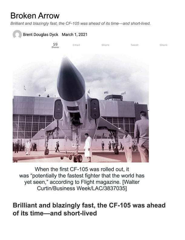 Story on the life and death of the Arrow. Includes section "Too Rich for Canada?" by P. Campagna