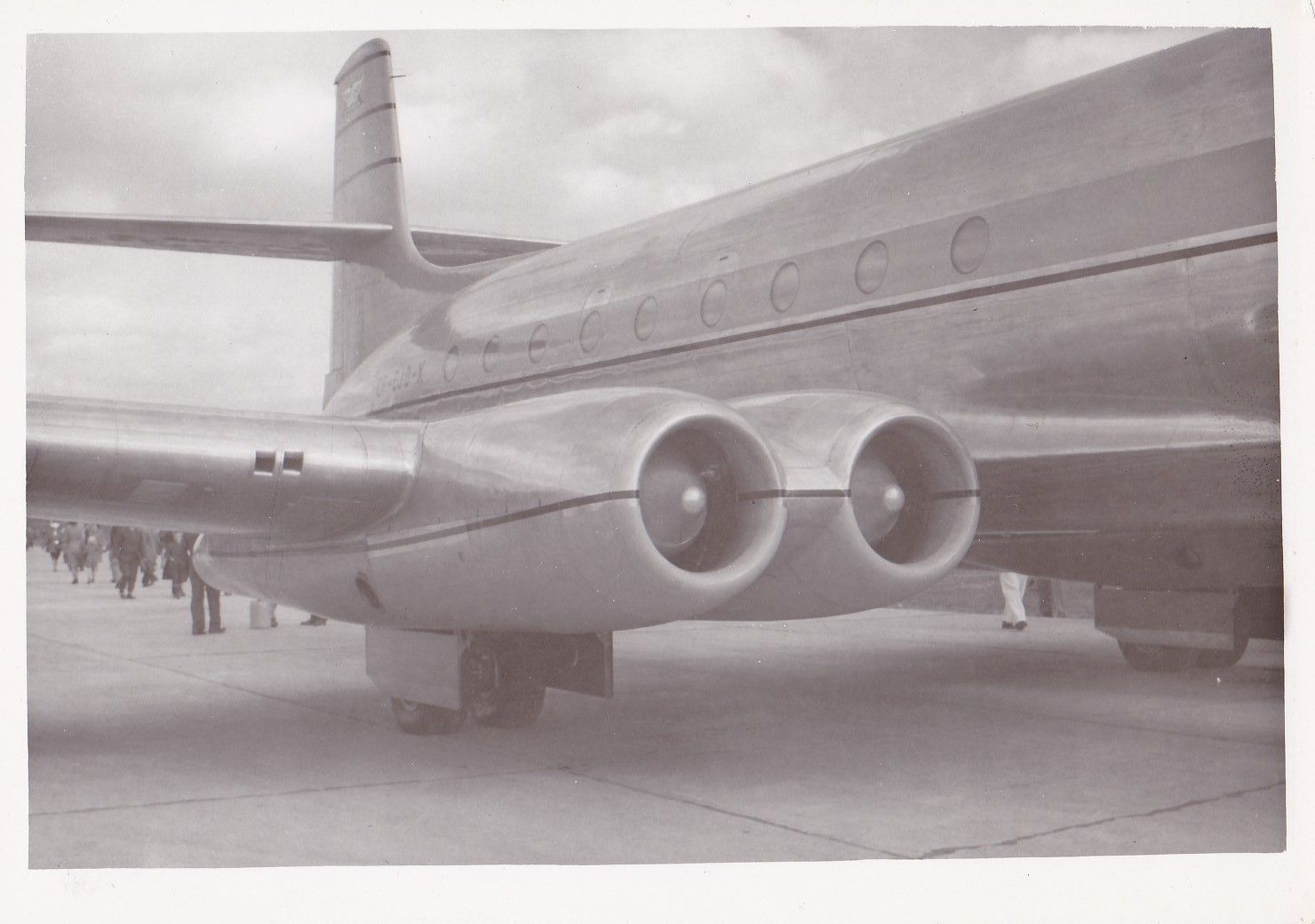 3.5" X 5" BW glossy photograph showing part of fuselage, wing and nacelles. Aircraft is on the tarmac. Notation indicates photo was donated by employee L.M. (Mel) Treleman.General Notes