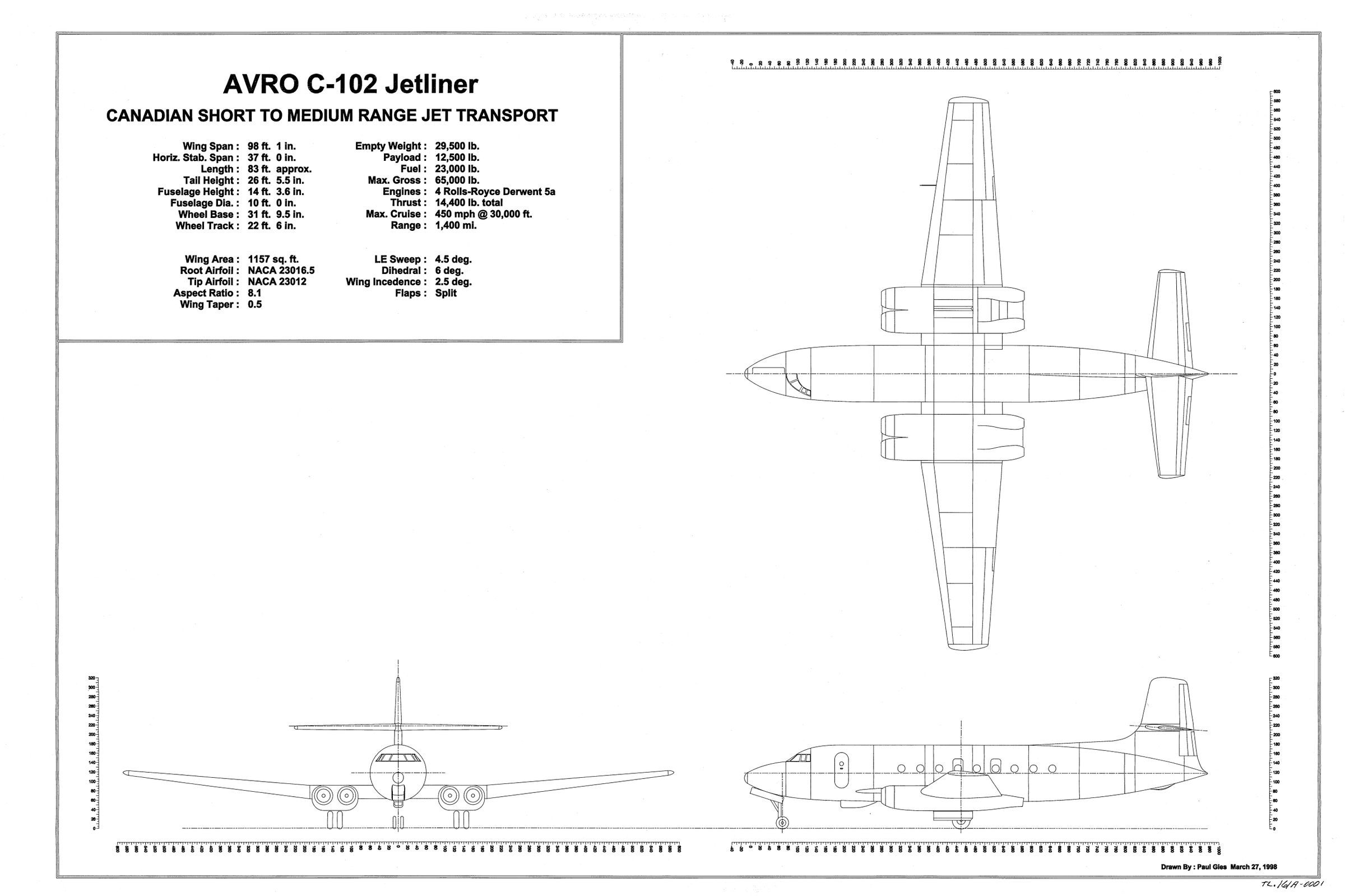 C-102 Jetliner - three view used as direct input for building of a model - updated 3/27/1998