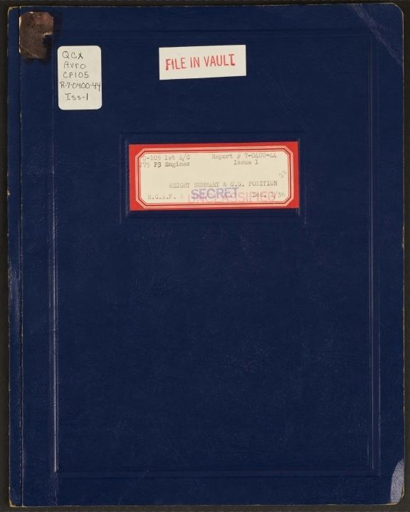 C-105 1st A/C with J75 P3 engines: weight & C.G. summary, Dec. 1/56 Report No. 7-0400-44 Issue 1