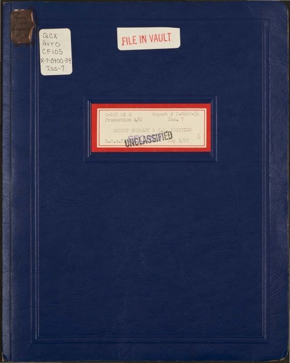 C-105 MK 2 production A/C: weight summary and C.G. position, May 1/57 Report No. 7-0400-34 Issue 7