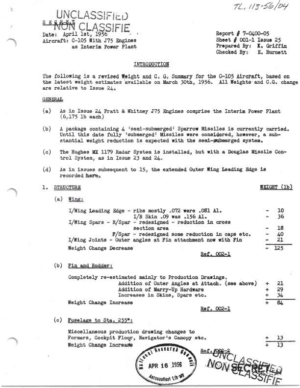 C-105 with J75 Engines as Interim Power Plant - Revised Weight and C.G. Report issue 25