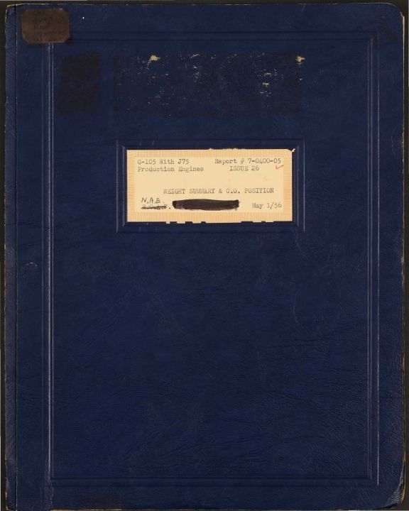 C-105 with J75 production engines: weight summary & C.G. position, May 1/56|C-105 with J75 engines as Interim power plant: weight summary and C.G. position, May 1/56 Report # 7-0400-05 Issue 26Entry/Object ID