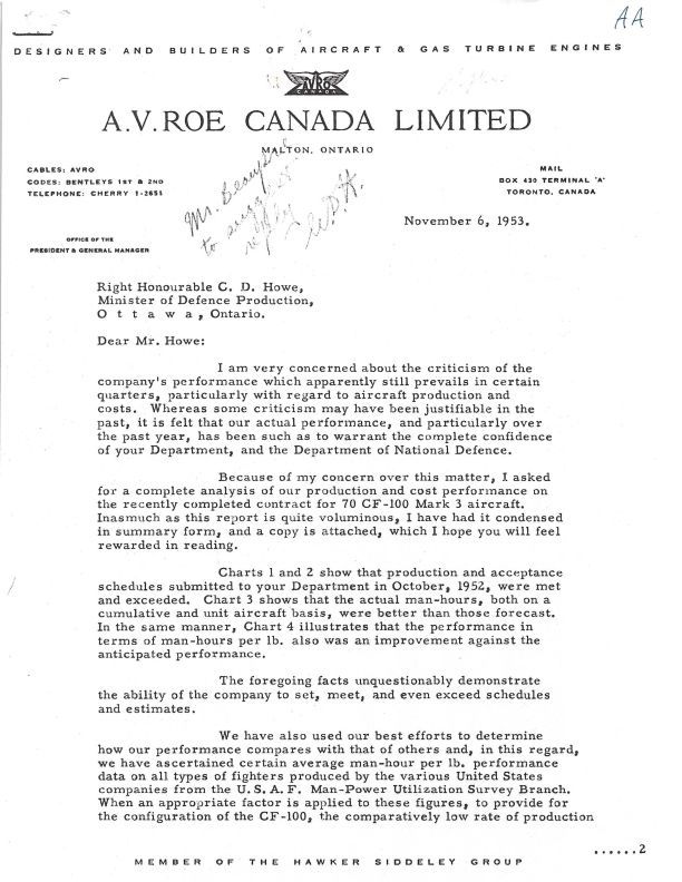 Crawford Gordon Jr writes to CD Howe to [resent the facts that refute the negative criticism regarding performance of the CF-100 production.