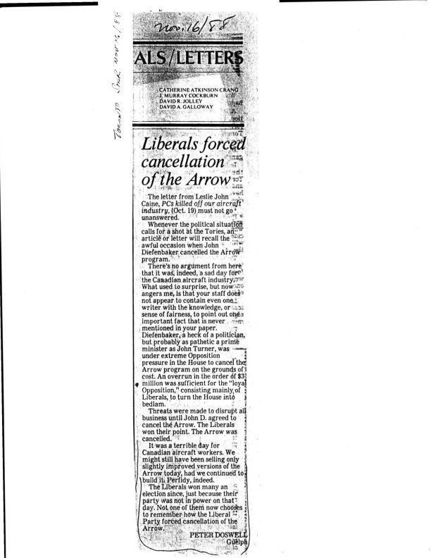 Writer suggests the Liberals forced the PC's to cancel the Arrow program
