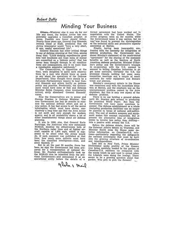 General Simonds was critical of the Arrow in 1956. Defense agenda discussed.