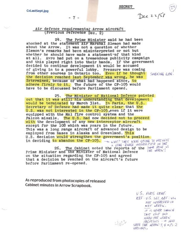 Secret Cabinet minutes. The Prime Minister is concerned the government may be accused of giving into a powerful lobby. The U.S. Secretary of Defence made it quite clear the U.S. was not interested in the CF-105 even it were equipped with the MA1 Fire Control System and the Falcon Missile.