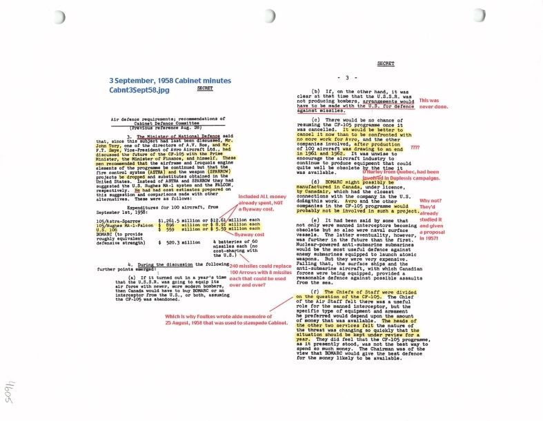 pg 2-5 (but marked in blue as Page 2) of Secret Cabinet minutes with respect to the CF-105 Arrow Programme. The minutes focus on the loss of highly skilled talent to the United States, discussion about the adoption of the Sparrow and Astra and the Falcon and Hughes Fire Control System.