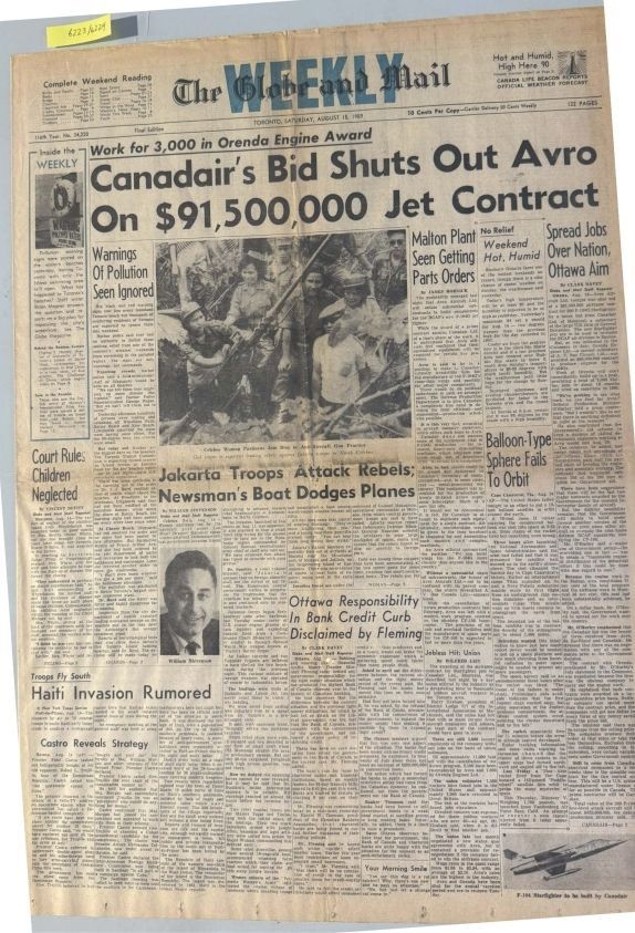From Globe and Mail 1959 August 15 pages 1,2 - Story about airframe contract for 200 F-104G fightersPublication Details