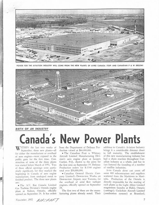 pg 7-10 - story includes Avro's Gas Turbine Division's Orenda Engine plan, Pratt & Whitney's Quebec plant and General Electric's Downsview Plant. With images of Avro's buillding, Orenda's plant interior with Orenda enginesGeneral Notes