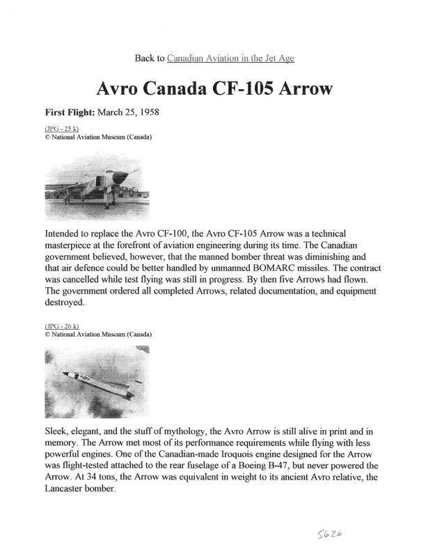 Web article summarizing the Arrow story and specifications relating to the Nat'l Aviation Museum's exhibit with the nose of 25206 which had been at the Institute of Aviation Medicine